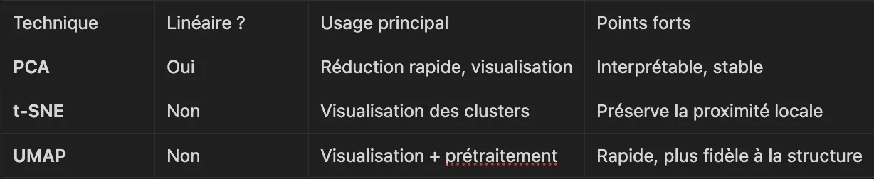 - Utile pour la visualisation et le prétraitement avant clustering.