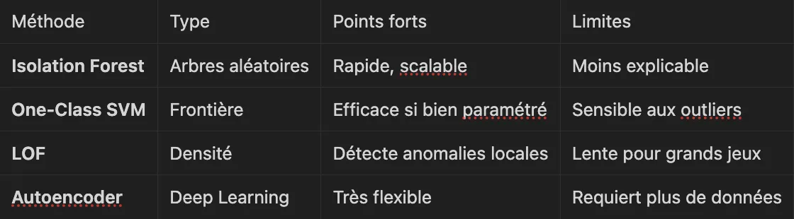 - Crée des arbres de partition aléatoires pour diviser les données : les anomalies sont isolées en peu de divisions.