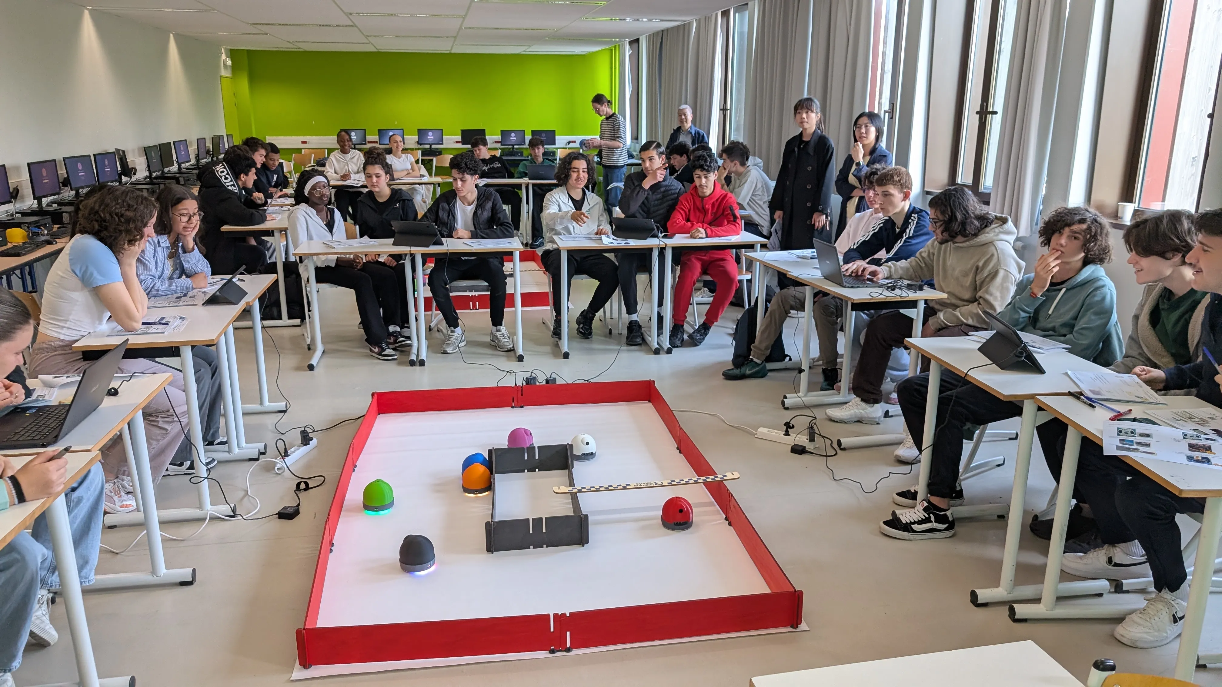 Ces ateliers ont été co-animés par une équipe de six chercheurs : Thomas Deneux et sa doctorante Marie Absalon, ainsi que Siu-Cheung Kong, Yin Yang, Wing Kei Yeung et So Sum Chow, venus spécialement de Hong-Kong pour l’occasion. Les élèves ont ainsi découvert, de manière ludique et interactive, des concepts aussi avancés que la rétropropagation ou l’apprentissage par renforcement, en les appliquant concrètement à travers la course de robots ou le suivi de ligne.