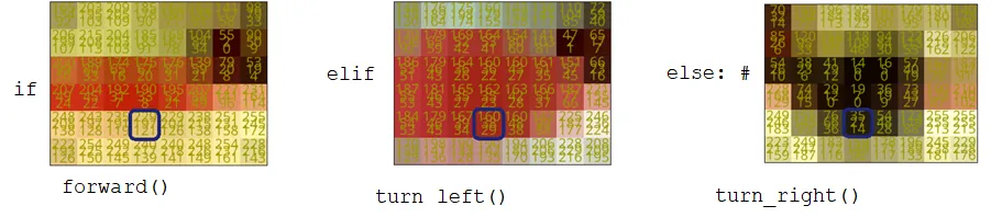 Sie haben wahrscheinlich schon festgestellt, dass es nicht immer das Beste ist, Entscheidungen auf der Grundlage eines einzigen Pixels zu treffen. Zum Beispiel kann es vorkommen, dass der Pixel in der fünften Zeile / vierten Spalte weiß ist, sodass der Roboter sich für die Vorwärtsbewegung entscheidet, während sich an der Seite eine Wand befindet und er sich stattdessen drehen sollte.