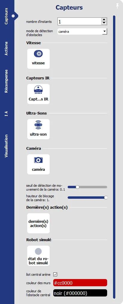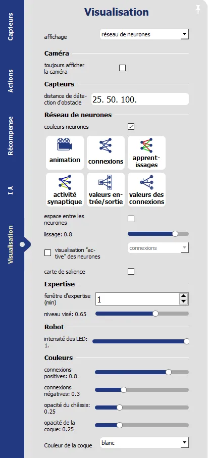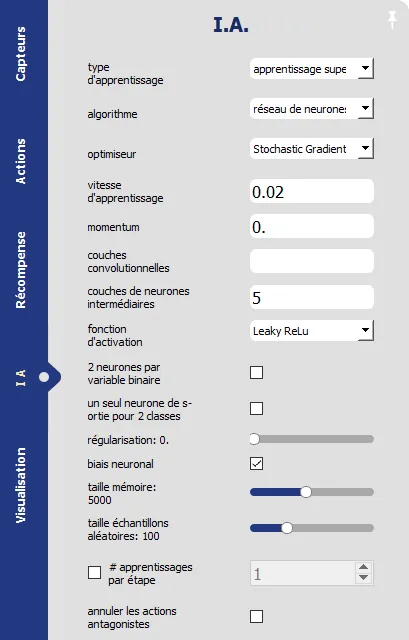 Auf der Registerkarte KI können Sie auswählen, auf welche Weise der Roboter trainiert wird, insbesondere, ob Sie zwischen überwachtem oder verstärkendem Lernen (Deep Q Learning) wählen. Außerdem können Sie hier die Parameter der verschiedenen Algorithmen einstellen.