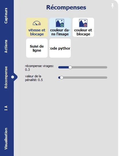 BelohnenSie den Roboter, wenn er schnell fährt, bestrafen Sie ihn, wenn er stehen bleibt. Sie können die Belohnung anpassen, die der Roboter erhält, wenn er eine Kurvenaktion ausführt, und den Wert der Strafe, wenn er blockiert oder rückwärts fährt.