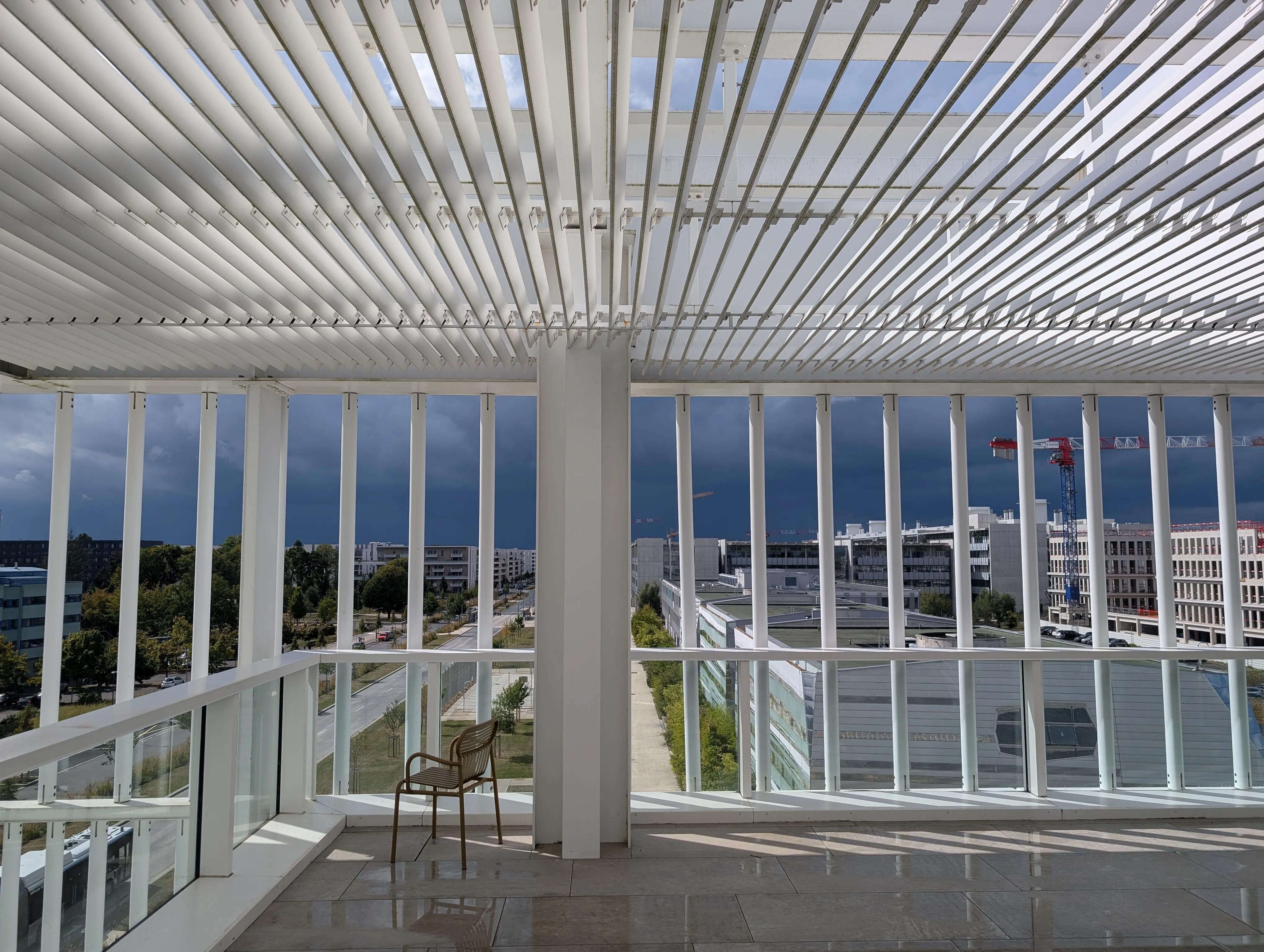 After the workshop, it was off to the Paris-Saclay campus. From the Lumen library, we took in the beautiful pre-storm light, the dramatic skies making the facades even sharper and the trees almost fluorescent. Then, true to Murphy's Law, just as we were about to take a stroll around the tree-lined campus... we got drenched!
