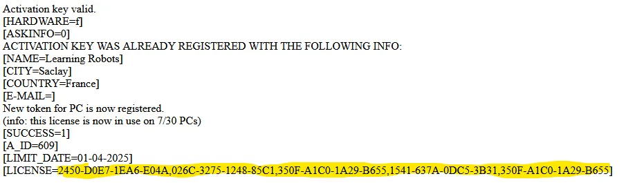 Il vous suffira alors de copier le numéro complet de licence (comme celui surligné ci-dessus) et de le coller dans l'emplacement prévu à cet effet.