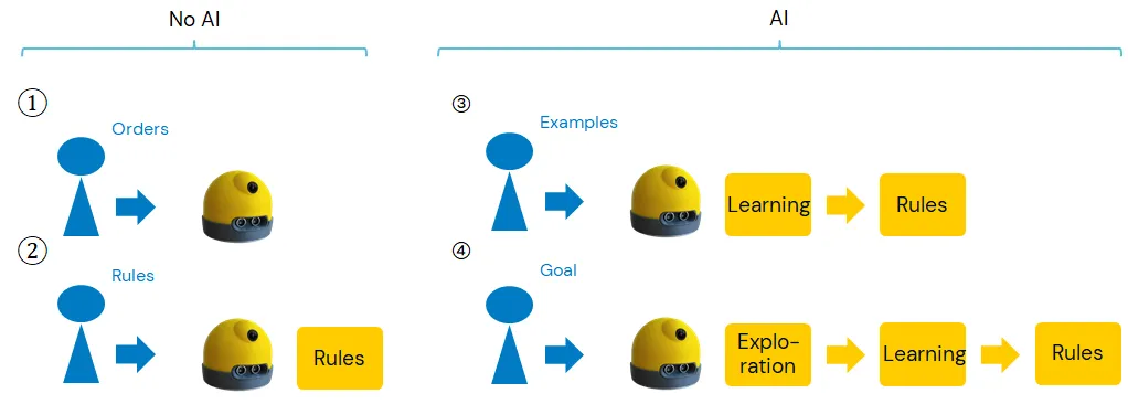 On expliquera clairement également la différence entre ce qui est appelé aujourd'hui "Intelligence Artificielle", à savoir les systèmes où il y a un apprentissage de la part de la machine (niveaux 3 et 4), par différence avec la programmation déterministe (niveau 2).