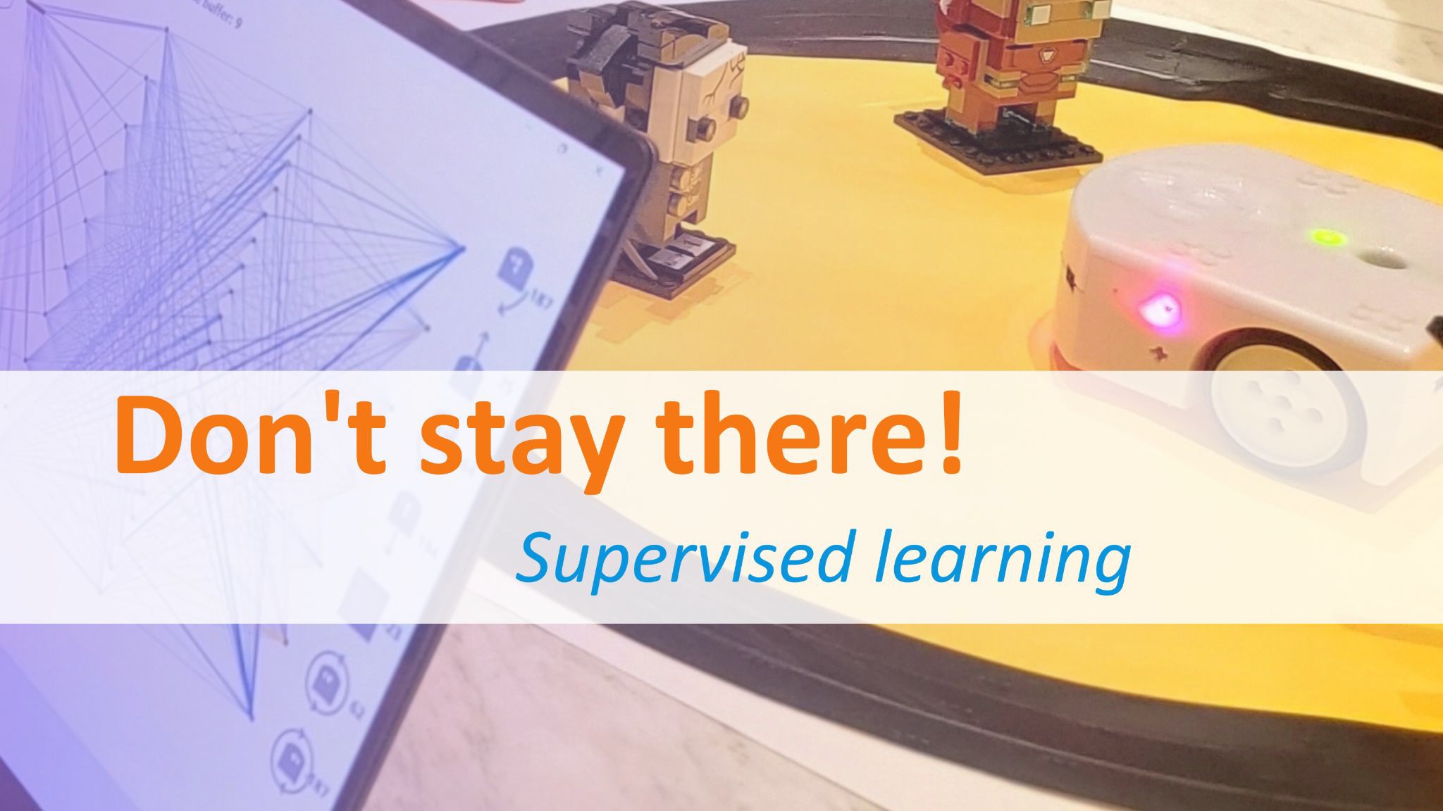 Nous allons apprendre à Thymio comment faire en utilisant la méthode découverte dans l'activité précédente, “Thymio le craintif”, la méthode apprentissage supervisé.On rappelle que dans l'apprentissage supervisé, nous avons regardé les valeurs de ses capteurs, puis nous avons dit à Thymio l'action à effectuer.Nous avions étudié seulement quelques situations importantes. Grâce au réseau de neurones, Thymio avait appris quoi faire dans les situations qu’il n’avait encore jamais rencontrées.
